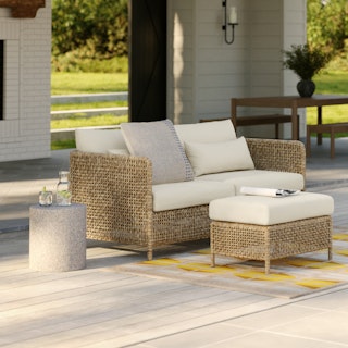 Get a little al fresco factime with your favorite person. The Aeri Lounge chairs are lthe perfect place to sit and connect with your pals, partner, or pup. Woven from matte resin wicker, set on a black metal frame, the chairs are also supremely easy to clean and care for. Same goes for the Solina: poured from terrazzo concrete, all you need is a damp cloth and 5 minutes.