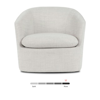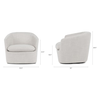 Turning heads is out; turning your entire body? In. The Turoy Swivel chair is a true statement piece. Upholstered with polished, smooth fabric, the Turoy is equal parts sinkable and stylish: an easy and versatile choice for any living area.