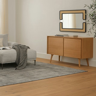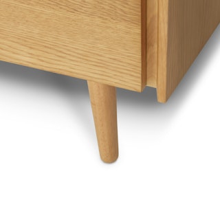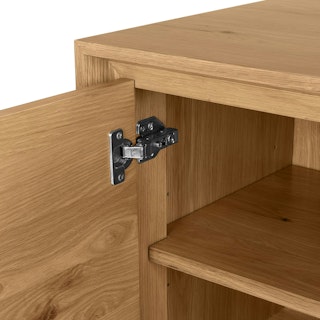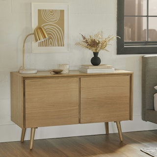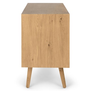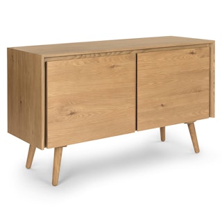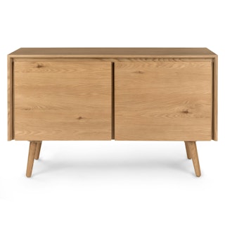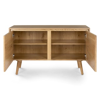 This mid-century modern sideboard is an elegant wood addition to any living space in need of a Danish modern touch. Store dinnerware in its two cabinets while displaying belongings (or a flatscreen) on its well-proportioned top. Each cabinet has one adjustable shelf.