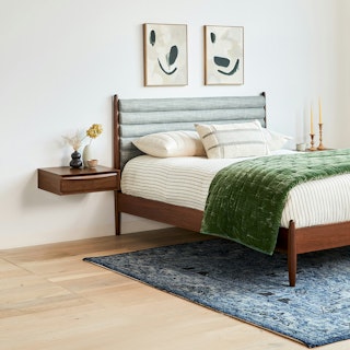 A floating nightstand, a plush and curvy bouclé fabric bed... sounds dreamy. The Lenia Nightstand is a minimalist gift wrapped in a classic mid-century modern package. The Kayra however, with its sculpted headboard and curvy proportions wrapped in fuzzy-but-chic fabric, feels more like a big bear hug — without the claws.