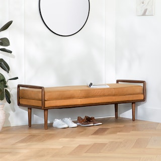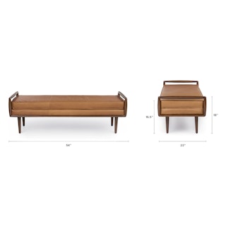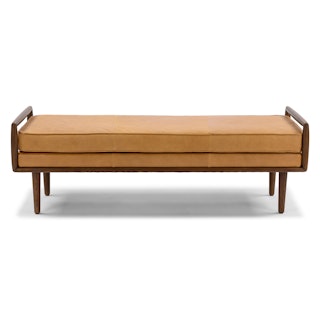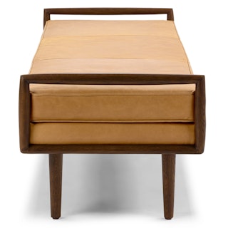 So atypical. With clean lines and a square figure typical of the mid-century modern era, the Ansa Bench is anything but typical. Square walnut arms capture the simple, piped-edge leather seat that sits atop tapered, wooden legs.