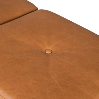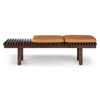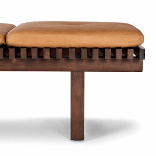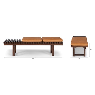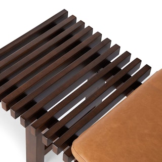 The Ripa Bench is a sleek new spin on an iconic mid-century design. The slatted seat inspires feelings of serenity, and is low enough to be used as a unique coffee table. Made with a solid wood, walnut-stained frame topped off with two tan leather cushions, the Ripa works as extra seating for your impromptu dinner party or as the most stunning catchall at the end of your bed.