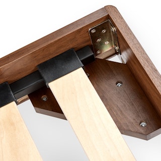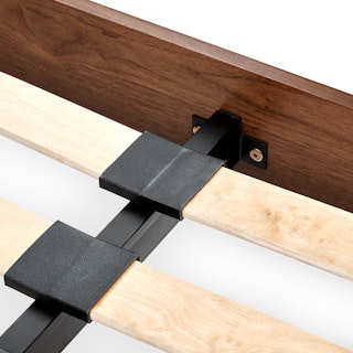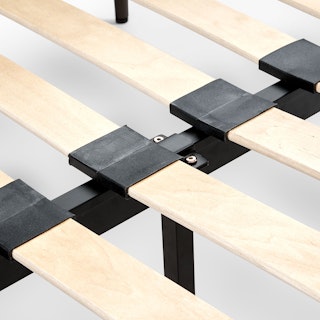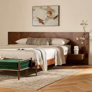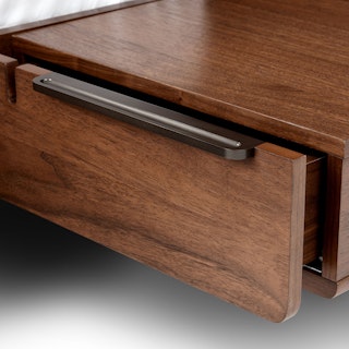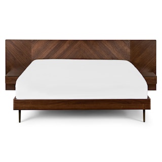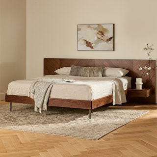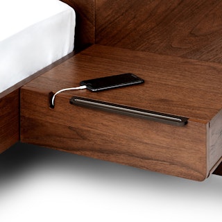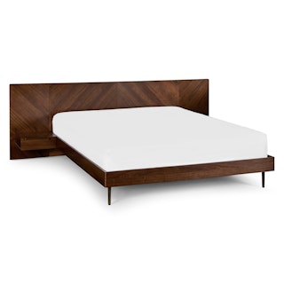 Behind closed doors. Designed to peek out from behind the comfort of a pillow-adorned mattress, the headboard of the low-profile Nera Bed, designed with a subtle chevron pattern, brings a natural warmth to any bedroom. Nightstand extensions featuring discreet cord management and soft-close drawers add a practical mid-century modern flair. Constructed of solid wood and wood veneer, the Nera Bed with Nightstands features two powder-coated steel legs at the foot of the bed for extra stability.