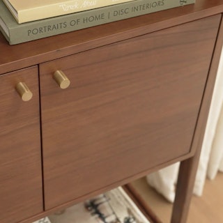 Love the shape and walnut colour. Stores a lot in the cupboard and holds my lovely wine glasses on the shelves.