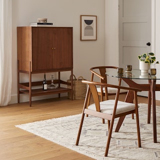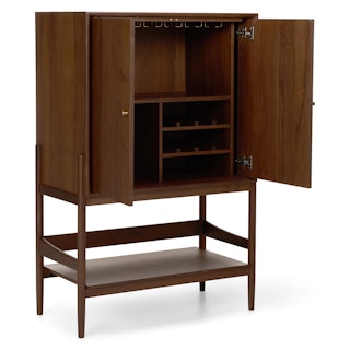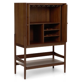 If you’ve ever dreamed of looking worldly, smart, even a little stern, let us introduce you to the Cotu Bar Cabinet. Made of solid and veneered walnut wood, the Cotu’s sleek pocket doors conceal thoughtful bar storage, including glass holders and bottle nooks. Finished with brass hardware, this mid-century modern looker is ready to add some flair to your living room.
