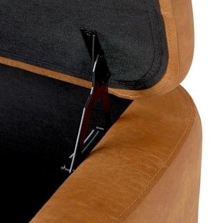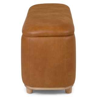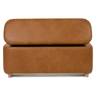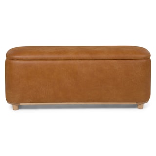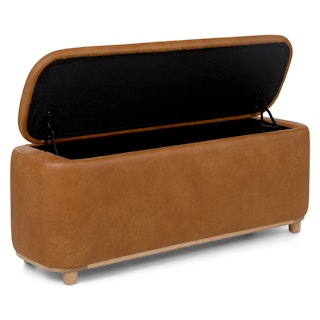 Holds your feet and your stuff. With its soft-close lid and ample storage space, the Maribo Ottoman is a stylish double-threat. Its soft, suede-like leather upholstery doesn't hurt either.