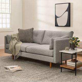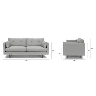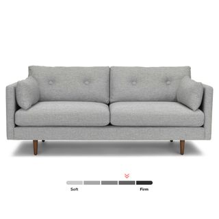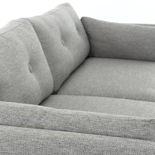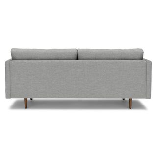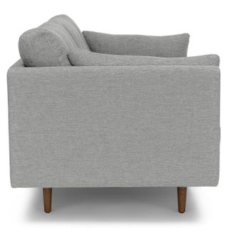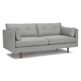 Poly-filled cushions are kept in check by the clean lines of this mid-century modern sofa. No-fuss upholstery and a neatly tufted button back make for an easy fit into even the most minimalist of living rooms.