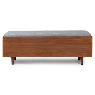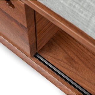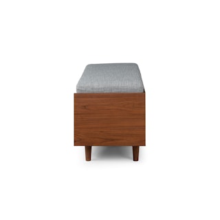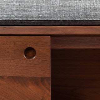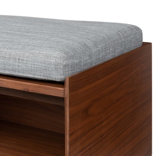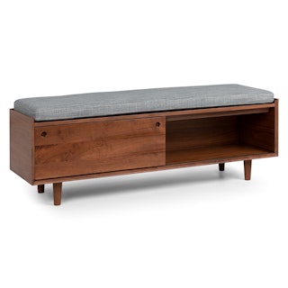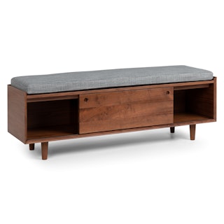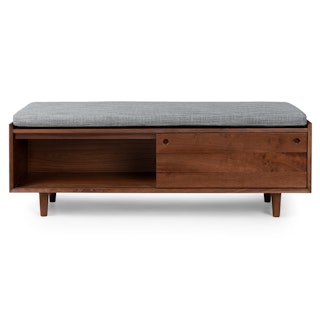 Put it away, put it away, put it away, now. The Nederin bench is the beautiful workhorse that your foyer or mudroom deserves. A broad storage compartment is accessed by a sliding solid wood panel so you can show-off your shoe collection at your leisure. Topped with a cozy foam cushion, the Nederin bench can also act as extra seating, in a pinch.