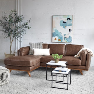 A honey oak stain trim and voluptuous leather cushions define this sectional with an updated mid-century modern style. Sink into the high-density foam-filled cushions and relax — you've come home to your new favorite place.