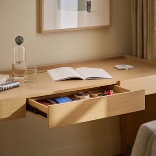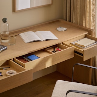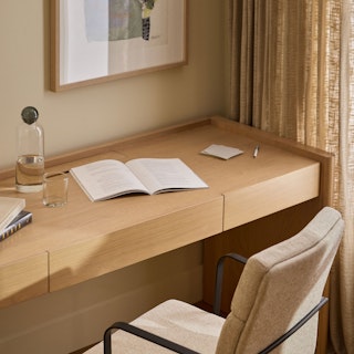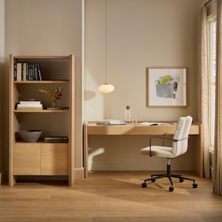 The magic of a Scandi-inspired office, all in one happy little bundle. Roll up to work on Bea, our cute and capable office chair, with plush fiber and foam-filled cushion, adjustable seat height, and a 360° swivel function. Once settled, bask in the practical and beautifully crafted Torme desk, boasting simple lines, softly rounded legs, and thoughtful details like soft-close drawers, hidden pulls, and cable management. Bring a minimalist Scandi aesthetic to your home office.
