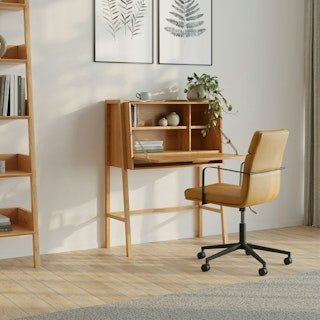 Classic elements, modern needs... that's the Mid-Century Office Bundle. The Gerven's buttery soft leather and sculpted metal armrests paired with Kacey's sturdy solid walnut frame and floating desktop design support your best work. The modular design lets you mount the Kacey desks drawer on either side of the work station. Go on, knock those KPIs out of the park.