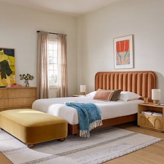 Channel your inner maximalist with our plush velvet Rolph headboard and fan-favourite Basi bed. The Velvet Vista Bundle evokes mid-century design with bright colors, a playfully shaped headboard, and a sleek, minimalist-style bed frame. The highest quality veneer, solid-plywood support slats, and solid wood legs, the Velvet Vista will support your dreams for years to come.
