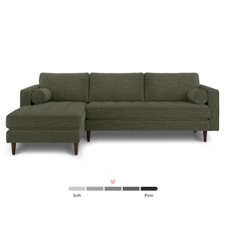 Oh, you like green space? This green sectional sofa is ready to snuggle. The Sven fir green sectional is made from a corner-blocked wooden frame and dapper medium-weave tweed fabric. Loose back cushions and bolsters make the Sven easy to clean, and great for arranging the perfect movie-watching position.