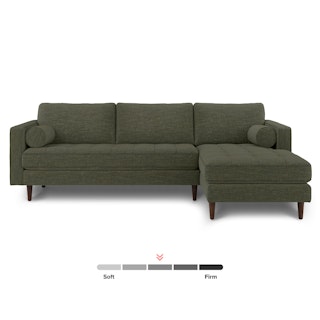 Oh, you like green space? This green sectional sofa is ready to snuggle. The Sven fir green sectional is made from a corner-blocked wooden frame and dapper medium-weave tweed fabric. Loose back cushions and bolsters make the Sven easy to clean, and great for arranging the perfect movie-watching position.