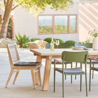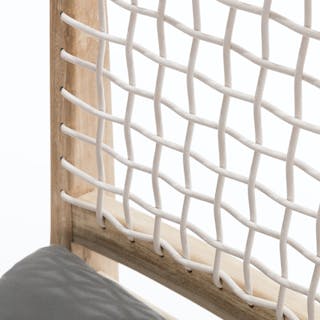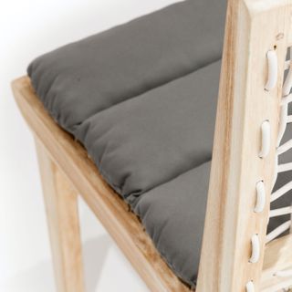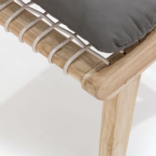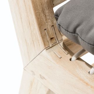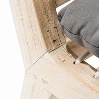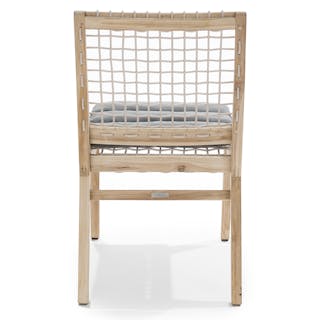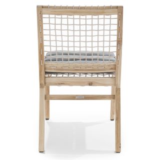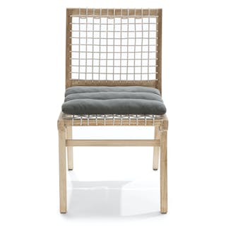 Solid construction and a bold design makes this an outdoor heirloom dining piece. Left raw with no chemical sealants, the true character of 100% teak is evident. A resilient eco-friendly resin webbing spans the seat and back of this chair, with added padding from a loose cushion. As it ages, teak will naturally develop a stunning silvery gray color. Our teak is traceable and certifiably sourced. Chairs are sold and shipped in pairs. Price is shown per chair