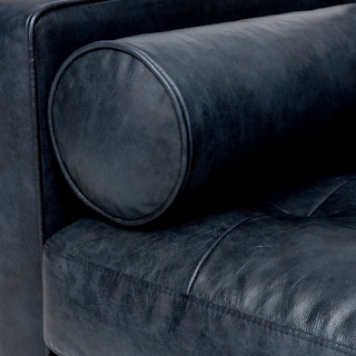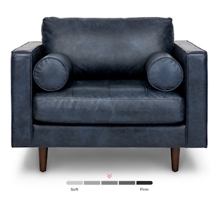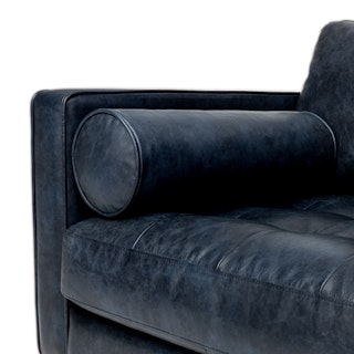 Our most popular sofa, reimagined as a large, cozy lounge chair. This modern take on a mid-century classic features clean lines, a tufted seat, and a luxuriously stuffed back cushion. Two matching round bolsters complete the look. Natural color variations, wrinkles and creases are part of the unique characteristics of this leather and it will develop a vintage slouchy look with regular use.