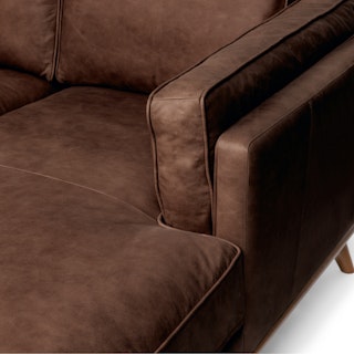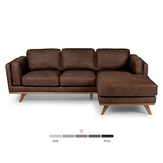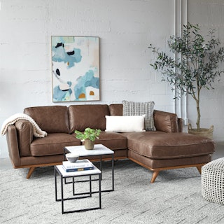 A honey oak stain trim and voluptuous leather cushions define this sectional with an updated mid-century modern style. Sink into the high-density foam-filled cushions and relax — you've come home to your new favorite place.