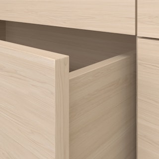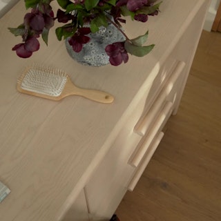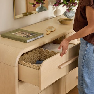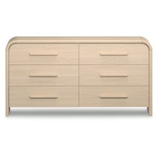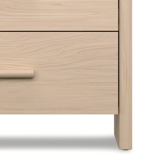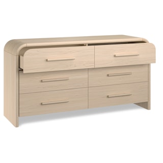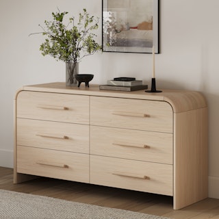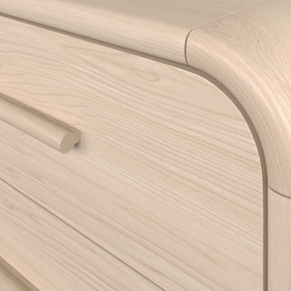 A design that's ahead of the curve. The Faydra dresser is bedroom storage at its most avant garde. With a unique sloping design and six handy drawers, the Faydra is more than just a pretty storage option: a veneered exterior and sculptural solid-wood handles, this is a pretty beautiful place to store your most prized garments.