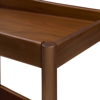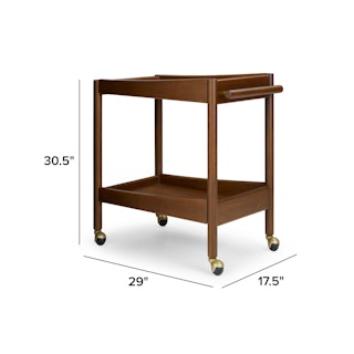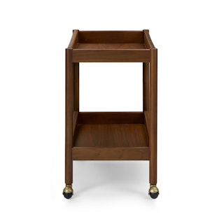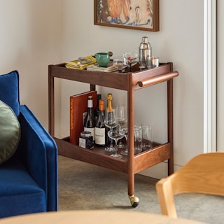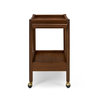 If you’ve ever dreamed of looking worldly, smart, or even a little stern, let us introduce you to the Cotu Bar Cart. Made of solid and veneered American black walnut, the Cotu bar cart features two generously sized serving platforms finished off with subtle brass hardware and a floating handle. This mid-century bar-on-wheels is ready to spice up your next soirée.
