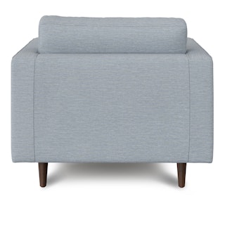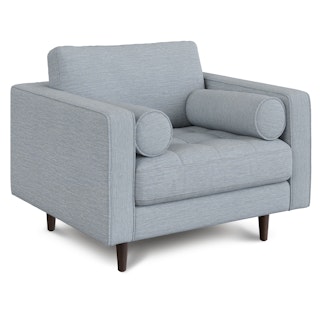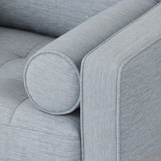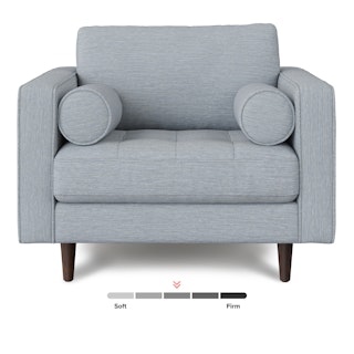 Our most popular sofa, reimagined as a large, cozy lounge chair. This modern take on a mid-century classic features clean lines, a tufted seat, and a luxuriously stuffed back cushion. Two matching round bolsters complete the look.