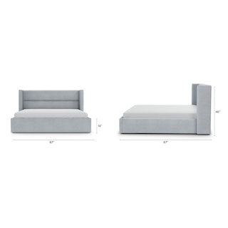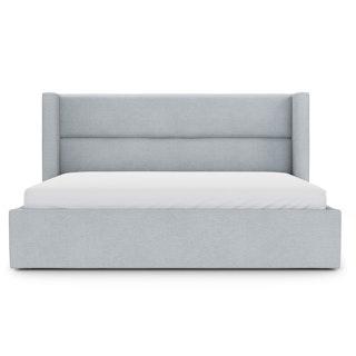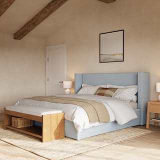 The CEO of dreamland. This generous wing-backed headboard has some pretty high expectations of your REM cycle. Upholstered with a linen-blend and padded with dense foam, the Calabri bed also features a generous upholstered base. Talk about an elevated aesthetic.