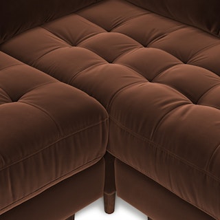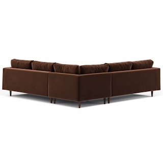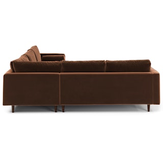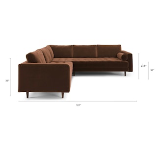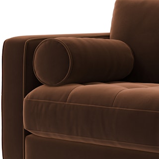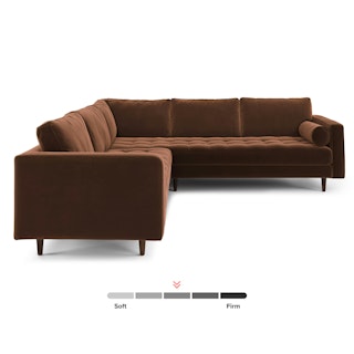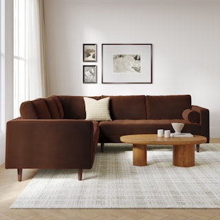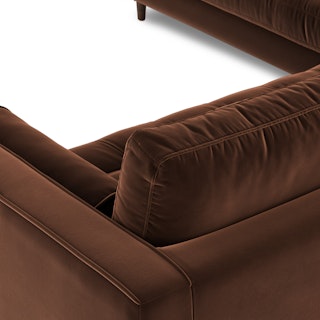 How does a person balance extravagance and practicality? With a velvet sectional sofa, obviously. With lux brushed velvet, loose back cushions and bolsters, and solid wood legs, there’s a reason this is our most popular sofa. A corner blocked wooden frame and slim walnut legs make for a sturdy and stylish movie-watching companion — pair with a smattering of tropical plants and coffee in a pretty mug.