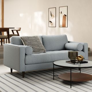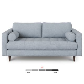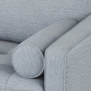 Our most popular sofa, reimagined for apartment living. This modern take on a mid-century classic features clean lines, a tufted benchseat, and luxuriously stuffed back cushions. Two matching round bolsters complete the look.