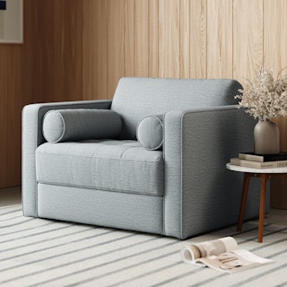 You know what they say: if you can't beat 'em, make the extremely cozy lounge chair into a sleeper lounge. People kept falling asleep on the Sven, so we've cut out the middle man and made the Sven Sleeper Lounge Chair. A tufted seat, precise piping, and round bolster pillows, plus! Plus! A fold out mattress so you can take your Sven lounge into a Sven nap. Stick that in your living room and sleep on it.