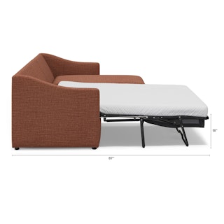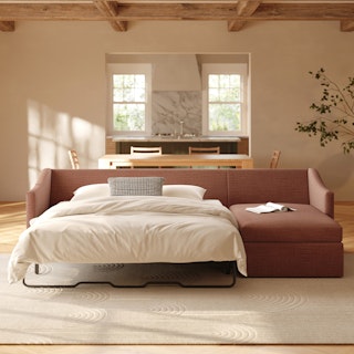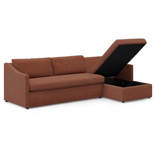 A minimal look with maximum impact... and maximum function. The Landry Sofa Bed marries laid back comfort with elegant details to produce a sofa that is as comfortable hosting movie night as it is your in-laws. Sloping sleigh-style arms and clean, straight lines make it simple to pair this sofa with many styles. With a spacious chest hidden below its chaise seat, and pull-out memory foam mattress, this sofa bed is compact, functional, and comfortable. Almost too comfortable.