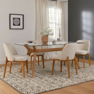 When we say "keep it light" this is what we mean: the Emmer and the Fonra, together in your dining space. Both built from solid wood, this table-and-chairs set works beautifully together because they establish a nice foundation for dinner without adding a lot of visual weight.