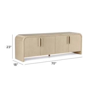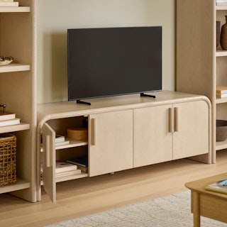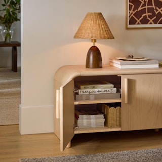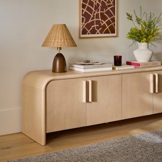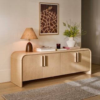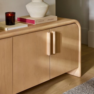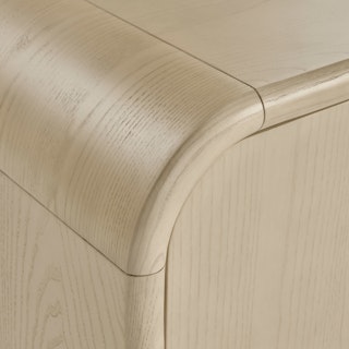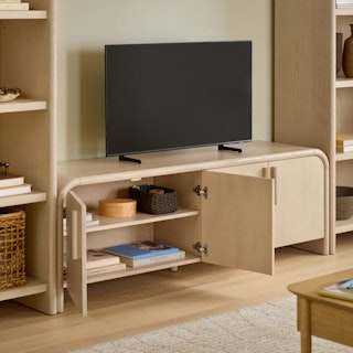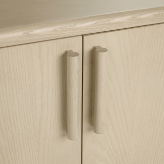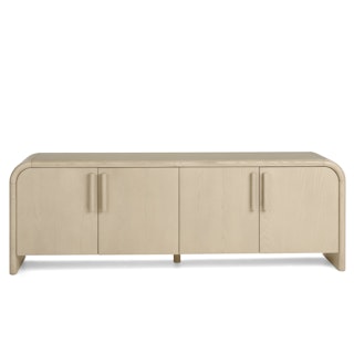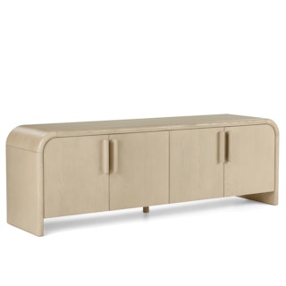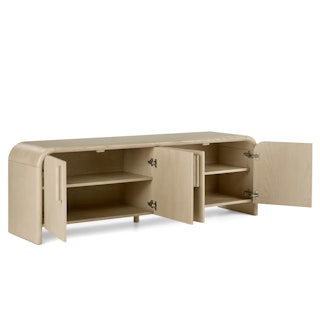 A media unit that's ahead of the curve. The Faydra is media storage at its most avant garde. With a unique sloping design, sleek cupboards, and thoughtful adjustable shelving, the Faydra is a statement-making storage solution. Finished with a veneered exterior and sculptural solid-wood handles, the Faydra shows us what attention-to-details looks like.