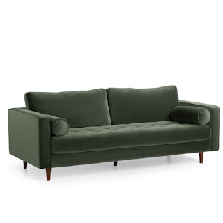 Maximum mid-century appeal. With its plush back cushions, bolsters made for regal lounging, and tufted bench seat, this velvet version of our Sven Sofa puts your calm, cool, creative style on display. This piece is poised on a wooden block frame and upholstered in soft brushed velvet. Pair this piece with a good book: the perfect combo for unwinding after a long day.
