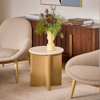 Made from a mix of veneered and solid wood: veneer is highly durable, whereas solid wood is used to build beautiful details and support weight