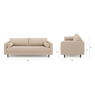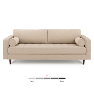 There’s a reason this is our most popular sofa. This modern take on a mid-century classic features crisp lines, a tufted benchseat, and two luxuriously stuffed back cushions. Two matching round bolsters complete the look.
