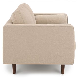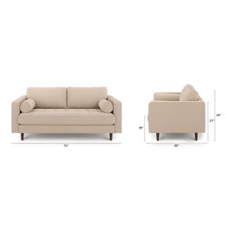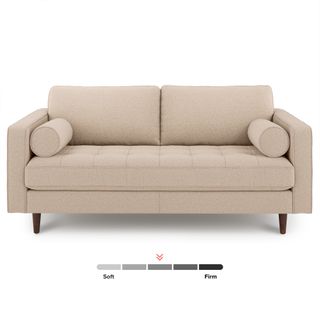 Our most popular sofa, reimagined for apartment living. This modern take on a mid-century classic features clean lines, a tufted benchseat, and luxuriously stuffed back cushions. Two matching round bolsters complete the look.