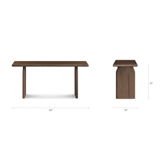 Welcome, Lloyd, the gentle giant. With a solid wood construction throughout, Lloyd's rustic charm comes from its wire-brushed finish, accentuating the natural wood grain and giving the piece a highly texturized look and feel. Its sizeable top rests boldly atop two arched plinth legs, offering a striking contrast against its soft, rounded edges. Lloyd is visually bold but soft at heart.