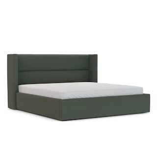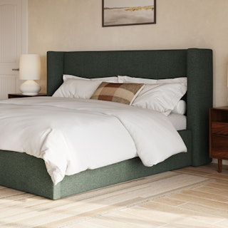 The CEO of dreamland. This generous wing-backed headboard has some pretty high expectations of your REM cycle. Upholstered with a linen-blend and padded with dense foam, the Calabri bed also features a generous upholstered base. Talk about an elevated aesthetic.