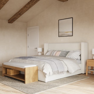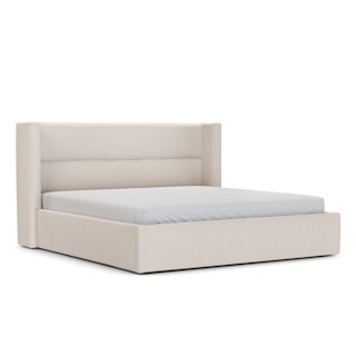The CEO of dreamland. This generous wing-backed headboard has some pretty high expectations of your REM cycle. Upholstered with a linen-blend and padded with dense foam, the Calabri bed also features a generous upholstered base. Talk about an elevated aesthetic.