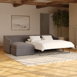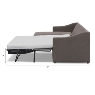 A minimal look with maximum impact... and maximum function. The Landry Sofa Bed marries laid back comfort with elegant details to produce a sofa that is as comfortable hosting movie night as it is your in-laws. Sloping sleigh-style arms and clean, straight lines make it simple to pair this sofa with many styles. With a spacious chest hidden below its chaise seat, and pull-out memory foam mattress, this sofa bed is compact, functional, and comfortable. Almost too comfortable.