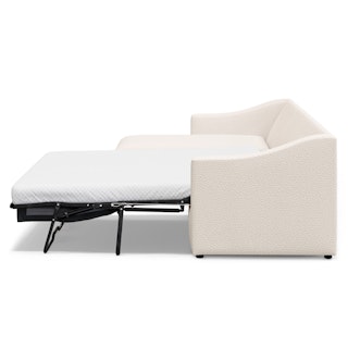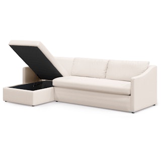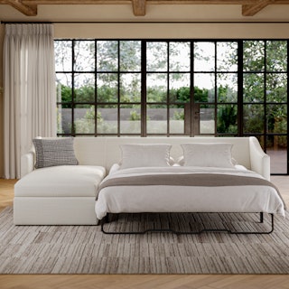 A minimal look with maximum impact... and maximum function. The Landry Sofa Bed marries laid back comfort with elegant details to produce a sofa that is as comfortable hosting movie night as it is your in-laws. Sloping sleigh-style arms and clean, straight lines make it simple to pair this sofa with many styles. With a spacious chest hidden below its chaise seat, and pull-out memory foam mattress, this sofa bed is compact, functional, and comfortable. Almost too comfortable.