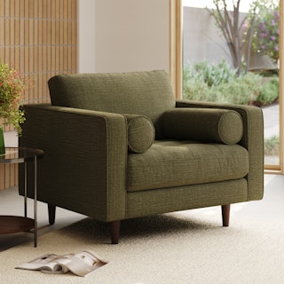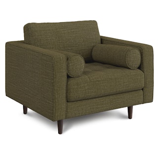 Our most popular sofa, reimagined as a large, cozy lounge chair. This modern take on a mid-century classic features clean lines, a tufted seat, and a luxuriously stuffed back cushion. Two matching round bolsters complete the look.
