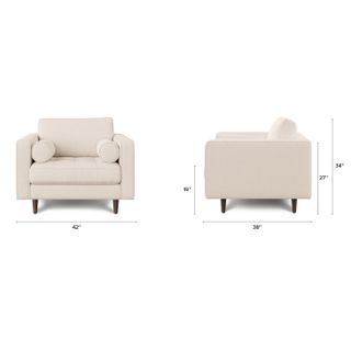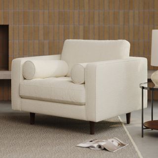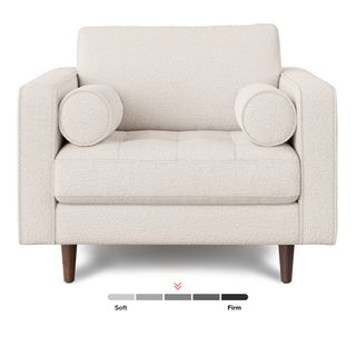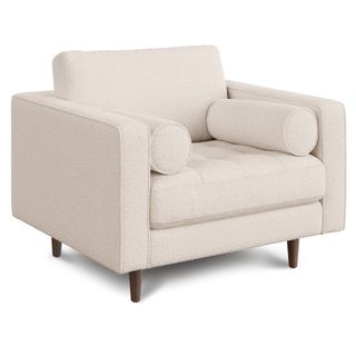Our most popular sofa, reimagined as a large, cozy lounge chair. This modern take on a mid-century classic features clean lines, a tufted seat, and a luxuriously stuffed back cushion. Two matching round bolsters complete the look.
