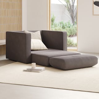 You know what they say: if you can't beat 'em, make the extremely cozy lounge chair into a sleeper lounge. People kept falling asleep on the Sven, so we've cut out the middle man and made the Sven Sleeper Lounge Chair. A tufted seat, precise piping, and round bolster pillows, plus! Plus! A fold out mattress so you can take your Sven lounge into a Sven nap. Stick that in your living room and sleep on it.
