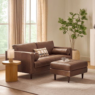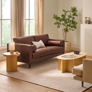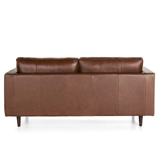 Snuggle up with your favorite pet on the loveseat version of our Sven Sofa. Built on a sturdy corner-blocked wooden frame, it's perfect for small spaces. With a comfy tufted bench seat, luxuriously plump back cushions, and matching round bolsters at either end, you get all the comfort of a full sized couch, but better space economy. Natural color variations, wrinkles and creases are part of the unique characteristics of full-aniline leather. It will develop a relaxed vintage look with regular use.