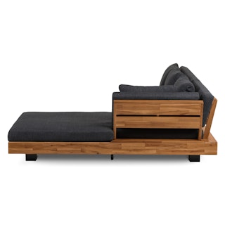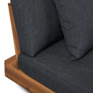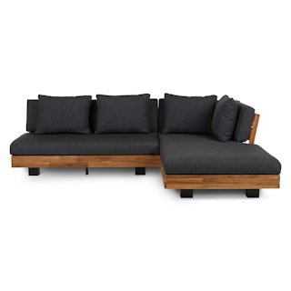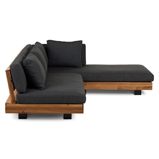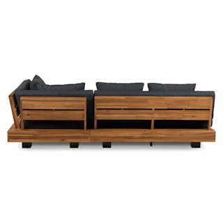 Stay a while. The Lubek sectional is built from a solid acacia wood base. The sofa is set close to the ground, encouraging you to really sink into (or even lie down on) those weather-resistant cushions. Dark cushions and super clean lines add to the Lubek’s modern look, while the warmth of the acacia wood makes the sofa easy to pair with any backyard set up. We call this look “low key modernism."