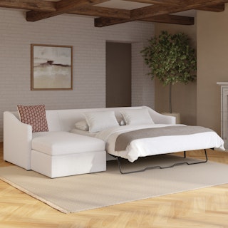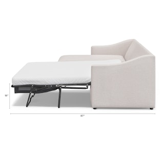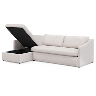 A minimal look with maximum impact... and maximum function. The Landry Sofa Bed marries laid back comfort with elegant details to produce a sofa that is as comfortable hosting movie night as it is your in-laws. Sloping sleigh-style arms and clean, straight lines make it simple to pair this sofa with many styles. With a spacious chest hidden below its chaise seat, and pull-out memory foam mattress, this sofa bed is compact, functional, and comfortable. Almost too comfortable.