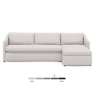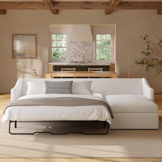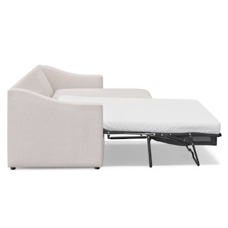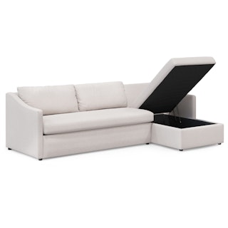 A minimal look with maximum impact... and maximum function. The Landry Sofa Bed marries laid back comfort with elegant details to produce a sofa that is as comfortable hosting movie night as it is your in-laws. Sloping sleigh-style arms and clean, straight lines make it simple to pair this sofa with many styles. With a spacious chest hidden below its chaise seat, and pull-out memory foam mattress, this sofa bed is compact, functional, and comfortable. Almost too comfortable.