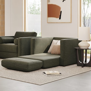 You know what they say: if you can't beat 'em, make the extremely cozy lounge chair into a sleeper lounge. People kept falling asleep on the Sven, so we've cut out the middle man and made the Sven Sleeper Lounge Chair. A tufted seat, precise piping, and round bolster pillows, plus! Plus! A fold out mattress so you can take your Sven lounge into a Sven nap. Stick that in your living room and sleep on it.