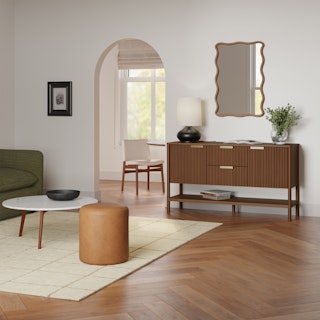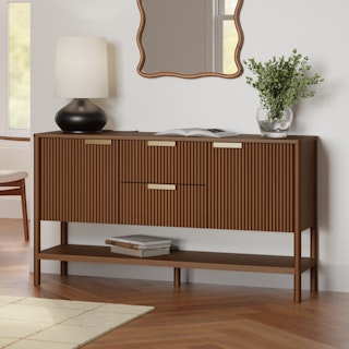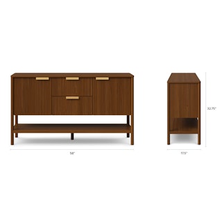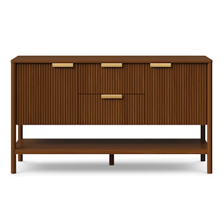 With brass handles, fluted wood fronts, and spindle legs, the Liv adds a touch of elegance to your storage needs. With two drawers, two cabinets, and plenty of open storage, the Liv ensures there is room for whatever you need to stash away — linens, drinkware, extra cutlery, you name it. Whether you’re making a statement or trying to organize the chaos, Liv will provide a calming presence.
