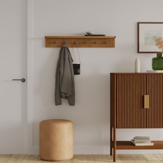 Meet Kouva. It's refined, well-balanced, and as aesthetically pleasing as the coats you'll hang from it. With six gunmetal knobs and a generous size shelf above, the Kouva offers a variety of storage space whilst its wooden tambour facade gives off Scandi-charm. Give your entryway the glow-up it deserves.